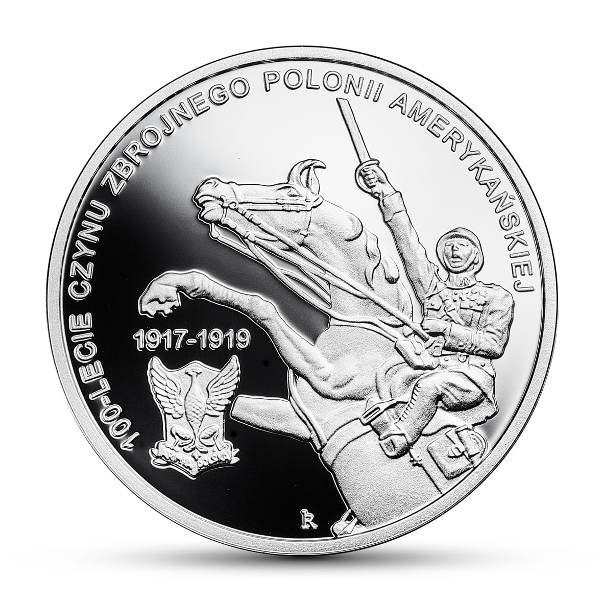 Na przełomie XIX i XX wieku, gdy polskie ziemie od dawna były podzielone między zaborców, Stany Zjednoczone Ameryki oraz Kanada przyjmowały kolejne grupy emigrantów z Polski, którzy szukali tu wolności politycznej i poprawy sytuacji ekonomicznej. Liczebność polskiej grupy etnicznej w Stanach Zjednoczonych przed I wojną światową szacowano na około 3 miliony osób (wliczając trzecie pokolenie emigrantów). Z kolei w Kanadzie liczebność polskich migrantów szacowano na około 60 tys. osób. Wraz z napływem kolejnych przybyszów powstawały tu polskie parafie, organizacje społeczno-polityczne, rozwijały się instytucje oświatowo-kulturalne. Aktywność polskich emigrantów na terenie Ameryki zaowocowała podczas I wojny światowej. Ówczesna Polonia, dzięki staraniom Wydziału Narodowego Polskiego Centralnego Komitetu Ratunkowego skupiającego największe organizacje (Związek Narodowy Polski, Zjednoczenie Polskie Rzymskokatolickie, Związek Polek w Ameryce i Związek Sokolstwa Polskiego w Ameryce), udowodniła, czym jest patriotyzm i ofiarność w pracy na rzecz Polski. Ponad dwadzieścia tysięcy polskich ochotników ze Stanów Zjednoczonych i Kanady zasiliło w latach 1917–1919 szeregi tworzącej się od 4 czerwca 1917 r. Armii Polskiej we Francji, tzw. Błękitnej Armii. Mobilizacja na taką skalę, prowadzona pod kierownictwem dr. Teofila Starzyńskiego (prezesa Związku Sokolstwa Polskiego w Ameryce), nie miała precedensu w dziejach polskiej diaspory. Akcja przygotowawcza trwała 4 miesiące (czerwiec-wrzesień 1917), a sam werbunek 16 miesięcy (paź- dziernik 1917 – luty 1919). Transport pierwszych 1200 ochotników po przeszkoleniu w Kanadzie odpłynął 16 grudnia 1917 r. z Nowego Jorku do Bordeaux. Łącznie z Ameryki przerzucono do Francji 20 720 osób. Systematyczny napływ ochotników z Ameryki umoż- liwił dalsze formowanie Armii Polskiej we Francji, bowiem do grudnia 1917 r. liczyła ona zaledwie 820 żoł- nierzy. 10 stycznia 1918 r. utworzono 1 Pułk Strzelców Polskich w 70 procentach złożony z ochotników z Ameryki. 10 kwietnia 1918 r. stan oddziałów polskich we Francji wynosił 204 oficerów i 10 638 szeregowych, co pozwoliło na zorganizowanie od 10 sierpnia 1918 r. jednej dywizji piechoty z oddziałami kawalerii, artylerii, oddziałów technicznych, służb pomocniczych i lotnictwa. Napływ ochotników z Ameryki iszybki rozwój Błękitnej Armii w 1918 r. wzmocniły politycznie działający w Paryżu Komitet Narodowy Polski, co symbolicznie potwierdziły podpisy Ignacego Jana Paderewskiego i Romana Dmowskiego złożone pod traktatem wersalskim 28 czerwca 1919 r. W działaniach wojennych na terenie Francji, na froncie ukraińskim oraz podczas wojny polsko-bolszewickiej za wolność Polski poległo 1832 ochotników z Ameryki, a kolejnych 2011 żołnierzy zostało rannych. Warto podkreślić, że na naszą wdzięczność historyczną zasługuje nie tylko poświęcenie zdrowia i życia ochotników z Ameryki, ale również zaangażowanie finansowe rodaków tam mieszkających. W latach 1914–1920 na sprawy polskie, w tym wojskowe, przeznaczyli oni ponad 16 milionów dolarów (obecnie byłoby to ok. 400 milionów dolarów). Na obu stronach srebrnej monety przedstawiono postacie z warszawskiego pomnika Czynu Zbrojnego Polonii Amerykańskiej, autorstwa rzeźbiarza Andrzeja Pityńskiego. W centralnej części rewersu monety znajduje się postać kawalerzysty Błękitnej Armii na koniu podczas ataku. W dolnym lewym polu widnieje orzeł ochotników z Ameryki, dzierżący w szponach szarfę z napisem ARMIA POLSKA. Na awersie monety przedstawiono dynamiczną postać żołnierza Błę- kitnej Armii, trzymającego w dłoniach sztandar z polskim orłem. Teofil Lachowicz