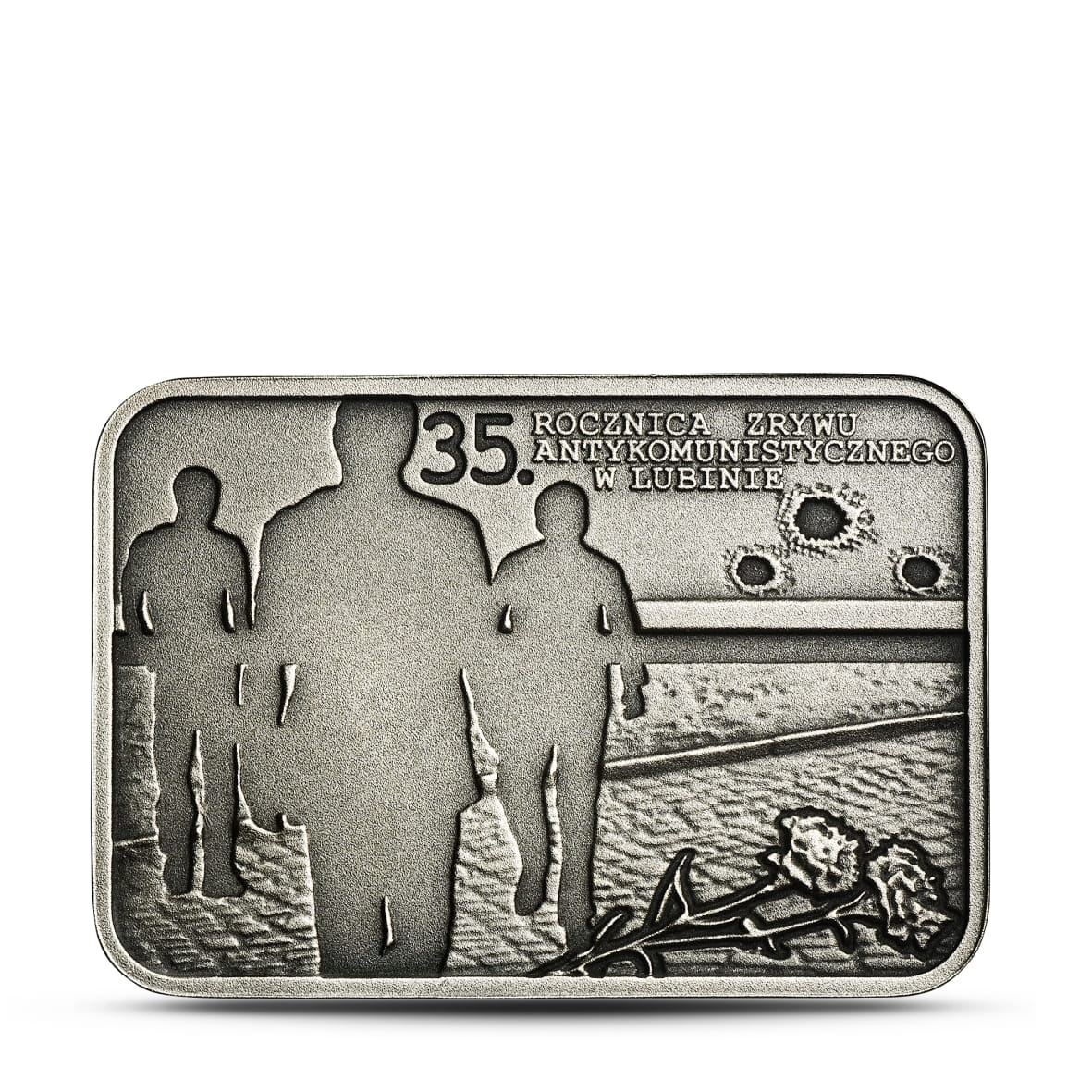 Lubin i okolice jeszcze w latach 50. XX wieku były najsłabiej zagospodarowanym i zaludnionym obszarem Dolnego Śląska. Jednak po odkryciu na tych terenach złóż miedzi i powołaniu Kombinatu Górniczo-Hutniczego Miedzi, który sfinansował wiele działań infrastrukturalnych, region się zmodernizował. W Lubinie wybudowano osiedla mieszkaniowe, ulice, szkoły, pawilony handlowe. Władza komunistyczna była przekonana, że mieszkańcy Lubina, można by rzec modelowego miasta tamtego ustroju, również modelowo myślą. Tym bardziej że działalność Solidarności w Zagłębiu Miedziowym między rokiem 1980 a 1981 nie wskazywała, że akurat tu będzie największy, poza Wrocławiem, ośrodek oporu społecznego w tej części Polski. Jednak zasięg strajków po wprowadzeniu stanu wojennego, a także determinacja załóg kopalń i huty „Głogów” pokazały, że nie będzie to obszar społecznie bierny. Z kolei pacyfikacja kopalni „Rudna” w pierwszych dniach stanu wojennego czy też niespotykane poza tym regionem akty podkładania niewielkich materiałów wybuchowych powodowały, że władze obawiały się, że 31 sierpnia 1982 r. – w 2.rocznicę podpisania porozumień sierpniowych – mogą tu wybuchnąć zamieszki. Faktycznie, demonstracje odbyły się we wszystkich miastach Zagłębia Miedziowego. W Lubinie też, choć nie była to demonstracja największa. Manifestanci skandowali hasła „Uwolnić internowanych”, „Znieść stan wojenny”. Inicjatorem manifestacji był Stanisław Śnieg, działacz Solidarności. Wygłosił przemówienie, w którym wezwał do uwolnienia osób więzionych ze względów politycznych. W interwencji mającej na celu rozproszenie manifestujących brały udział oddziały Milicji Obywatelskiej oraz oddziały Zmotoryzowanych Odwodów Milicji Obywatelskiej (ZOMO), które w pierwszej fazie zamieszek miotały w kierunku manifestantów środki chemiczne, a następnie użyły broni z ostrą amunicją. Do tej pory nie wyjaśniono przyczyn takiego stanu rzeczy. Rannych zostało ponad dwadzieścia osób, z tego siedem ciężko; trzy postrzelone osoby – Andrzej Trajkowski, Mieczysław Poźniak i Michał Adamowicz – zmarły. 28 sierpnia 2017 roku Narodowy Bank Polski wprowadza do obiegu srebrną monetę o nominale 20 zł „35.rocznica zrywu antykomunistycznego w Lubinie” Niespokojnie w Lubinie było jeszcze przez 48 godzin – 1 września demonstrowało 15 tys. mieszkańców, dzień później niespełna pięć tysięcy. Dochodziło do zamieszek i niepokojów. Aby powstrzymać falę protestu, zgromadzono ponad 1000 funkcjonariuszy spoza terenu województwa, a samo miasto odcięto od reszty kraju na siedem dni. Do dnia dzisiejszego nie wszyscy sprawcy tej masakry ponieśli karę. Symbolem wydarzeń w Lubinie jest zdjęcie Krzysztofa Raczkowiaka, na którym widoczny jest umierający Michał Adamowicz niesiony przez grupę mężczyzn. Zdjęcie – milczący świadek tamtych wydarzeń. Na rewersie monety przedstawione zostały zarysy trzech męskich postaci, obok których widnieją symboliczne trzy ślady po pociskach, szarfa oraz dwa goździki leżące na bruku. Na awersie monety przedstawiono biało-czerwoną szarfę na tle sylwetek trzech mężczyzn, symbolizujących ofiary wydarzeń w Lubinie. dr Marek Zawadka