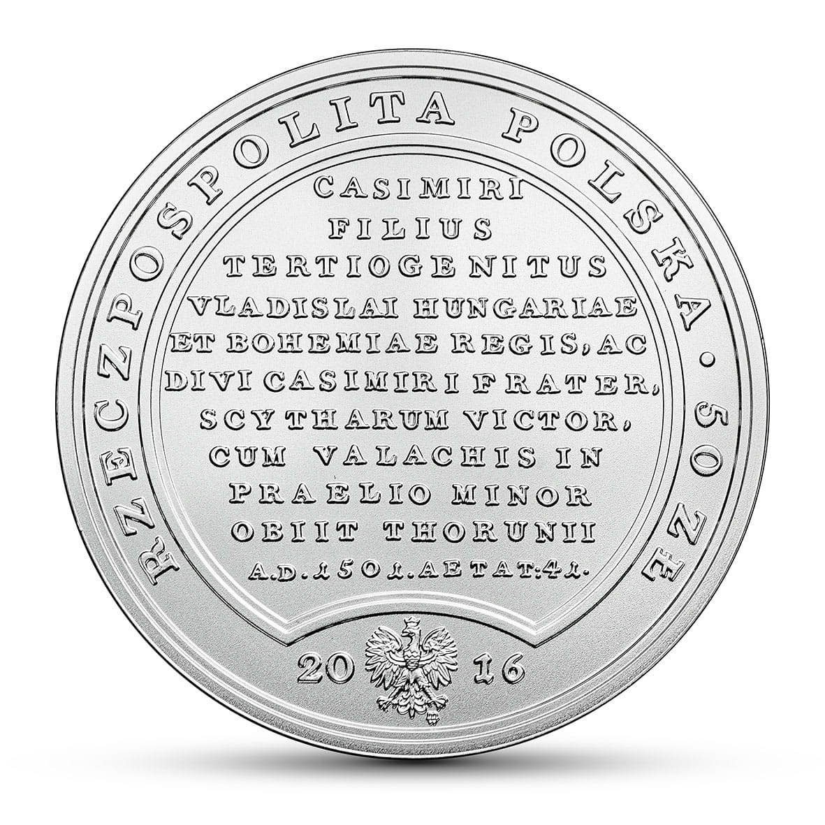 Dziesiąta moneta serii ukazuje Jana Olbrachta, trzeciego syna Kazimierza Jagiellończyka, króla Polski od 1492 r., księcia głogowskiego do 1498 r., nieskutecznie obranego królem węgierskim w 1490 r. Jego krótkie panowanie było trudne, obciążone klęską bukowińską. Na ten czas została zerwana unia personalna polsko-litewska (tron wielkoksiążęcy na Litwie objął jego brat Aleksander). Na medalowym popiersiu króla, w profilu zwróconym w prawo (według portretu pędzla Marcella Bacciarellego), widać podobieństwo rysów twarzy do rzeźby gotycko-renesansowego nagrobka w katedrze na Wawelu. Na medalu król nosi kołpak ze strusim piórem, na płaszczu zawieszony złoty łańcuch z medalionem. Na awersie monety czytamy, nieznacznie skrócony, tekst przeniesiony z rewersu medalu (w tłumaczeniu): Kazimierza syn trzeci, brat Władysława, króla Węgier i Czech, a także Świętego Kazimierza, zwycięzca Tatarów, pokonany w bitwie z Wołochami. Umarł w Toruniu Roku Pańskiego 1501, mając lat 41, w 9. roku panowania, dnia 7 sierpnia. Jan Olbracht, urodzony w 1459 r., był trzecim synem Kazimierza Jagiellończyka i Elżbiety Rakuszanki. Przyłączył księstwa zatorskie i płockie do Korony. W polityce zagranicznej skupił się na walce z Tatarami i Turkami, a także dążeniu do odzyskania polskiej zwierzchności nad Mołdawią i Wołoszczyzną, lenn Polski od 1387 r. Wyprawa pospolitego ruszenia szlacheckiego w 1497 r. zakończyła się klęską w bitwie pod Koźminem na Bukowinie, gdzie zginęło około 5 tys. polskiej szlachty (mawiano „Za króla Olbrachta wyginęła szlachta”). Wojnę przerwał rozejm w 1501 r. W celu pozyskania podatków na obronność poszerzono szlachcie przywileje (1496 r., statuty piotrkowskie). Ważne zmiany zaszły w polskim parlamentaryzmie – dotychczasowa Rada Królewska przekształciła się w Senat, a zjazdy sejmików szlacheckich w Izbę Poselską Sejmu, co stworzyło podwaliny tzw. demokracji szlacheckiej. Jan Olbracht zmarł bezpotomnie, został pochowany na Wawelu, a jego serce złożono w bazylice św. Janów w Toruniu. Marta Męclewska