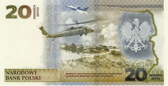 Na drugiej stronie banknotu widnieje godło, orzeł biały przy linii granicy wschodniej, panorama z polami, łąkami i drzewami, oraz helikopter i samolot bojowy. W lewym górnym rogu banknotu oraz prawym dolnym cyfrą jego nominał 20 oraz słownie napisy z dużych lister: dwadzieścia złotych. W lewym dolnym rogu w dwóch rzędach z dużych liter napis: Narodowy Bank Polski