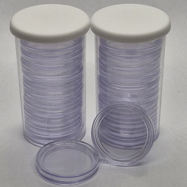 Ekonomiczna wersja kapsli na monety dobre jakości. Szczelnie przylegające do siebie elementy, dzięki czeku po zamknięciu nie oddziałują na monety wprost czynniki zewnętrzne.