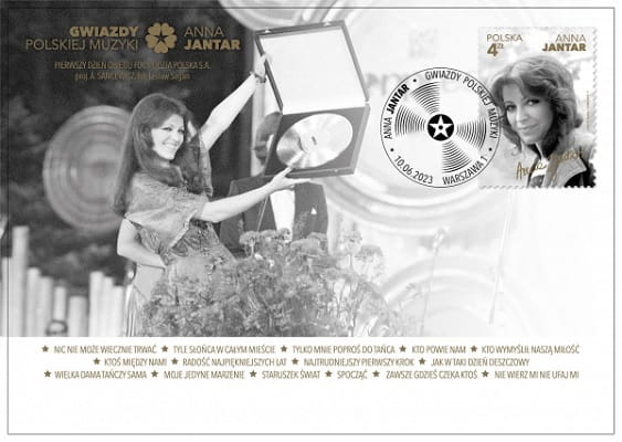 Fotografia Anny Jantar, trzymającej w ręku nagrodę płytę. U góry koperty napis w dwóch rzędach: Gwiazdy / Polskiej Muzyki logo serii oraz po drugiej stronie napis: Anna / Jantar. U dołu koperty na wyodrębnionym białym tle tytuły utworów piosenek Anny Jantar: m.in: "Nic nie może wiecznie trwać", Tyle słońca w całym mieście", "Tylko mnie poproś do tańca". Znaczek i koperta ze stemplem okolicznościowym z datą emisji 10.06.2023