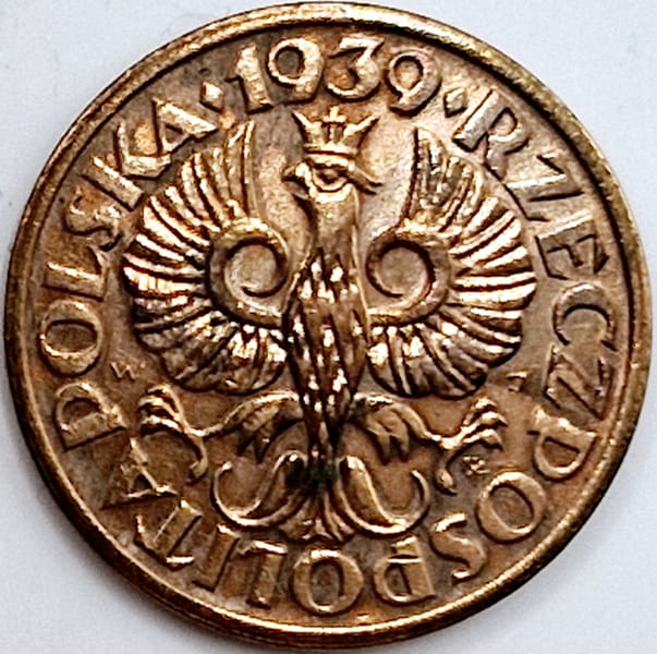 1 grosz 1939 r. - moneta obiegowa z okresu II Rzeczpospolitej Polskiej, metal brąz, emitent Bank Polski, producent Mennica Państwowa, stempel zwykły, stan zachowania +3, real foto