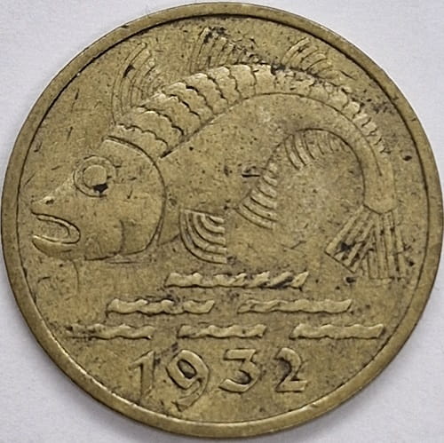 Na awersie u góry stylizowany wizerunek ryby dorsza, poniżej stylizowane linie fal w trzech rzędach. U dołu monety rok jej emisji 1932
