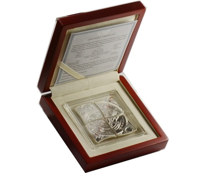 4 x 10 zł Mistrzostwa Europy Polska-Ukraina 2012 r. puzzle - monety kolekcjonerskie 10 zł NBP w drewnianym pudełku z certyfikatem, stan zachowania menniczy