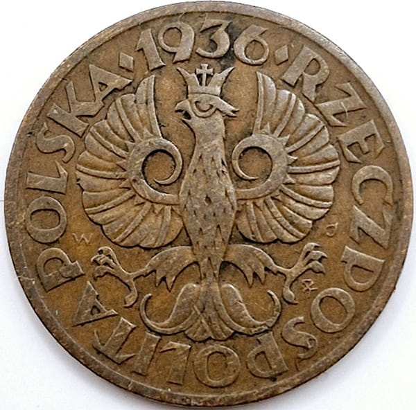 Na awersie w centrum widnieje orzeł w koronie ustanowiony dla godła Rzeczypospolitej Polskiej. W otoku monety przy jej rancie napis dużymi literami: Rzeczpospolita Polska oraz rok emisji monety 1936 u góry przy rancie. Nad łapami orła inicjały projektanta, po lewej stronie W po prawej stronie J. Między szponami ówczesny znak mennicy strzała - herb Kościesza