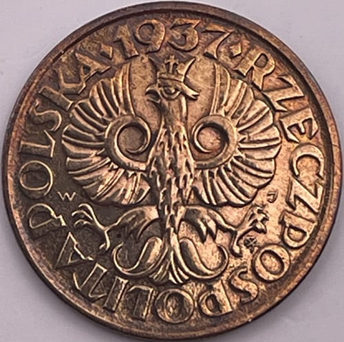 2 grosze 1937 r. - moneta obiegowa z okresu II Rzeczpospolitej Polskiej, metal brąz, emitent Bank Polski, producent Mennica Państwowa, stempel zwykły, stan zachowania +2, real foto