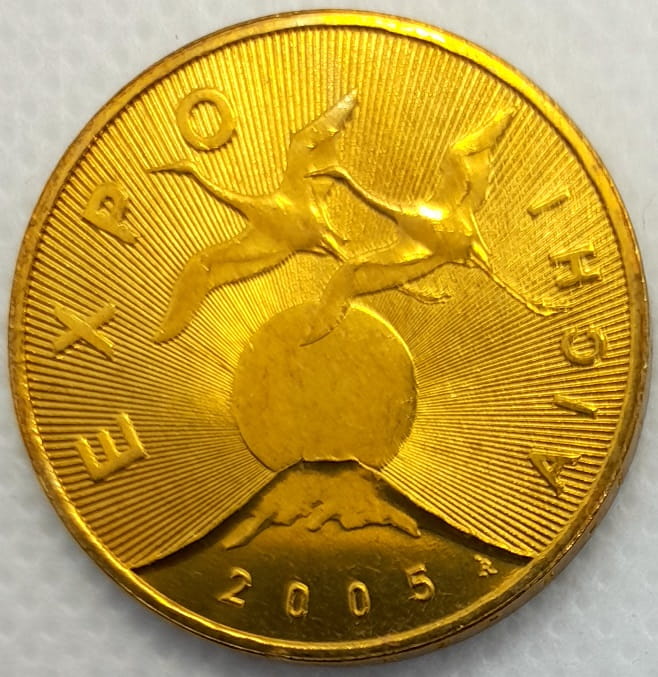 Na rewersie monety stylizowany wschód słońca nad górą Fuji na tle ozdobnego reliefu. U góry wizerunek dwóch Żurawi w locie. Z lewej strony półkolem napis: EXPO, z prawej półkolem napis: AICHI. U dołu napis: 2005.