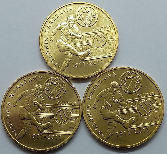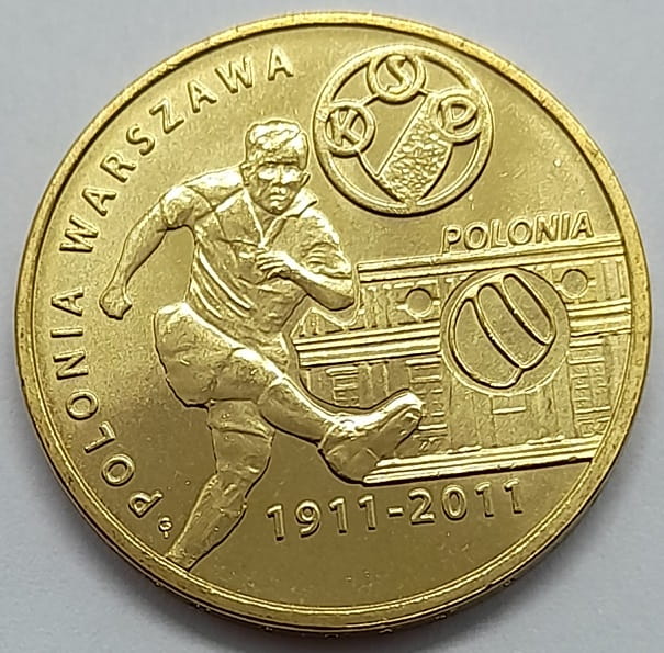 Na rewersie piłkarz kopiący piłkę, w tle stylizowany wizerunek fragmentu budynku klubowego z napisem na jego dachu: POLONIA. Z lewej strony monety przy rancie półkolem napis: POLONIA WARSZAWA. U dołu monety data założenia klubu 1911 oraz data jubileuszowa 2011.