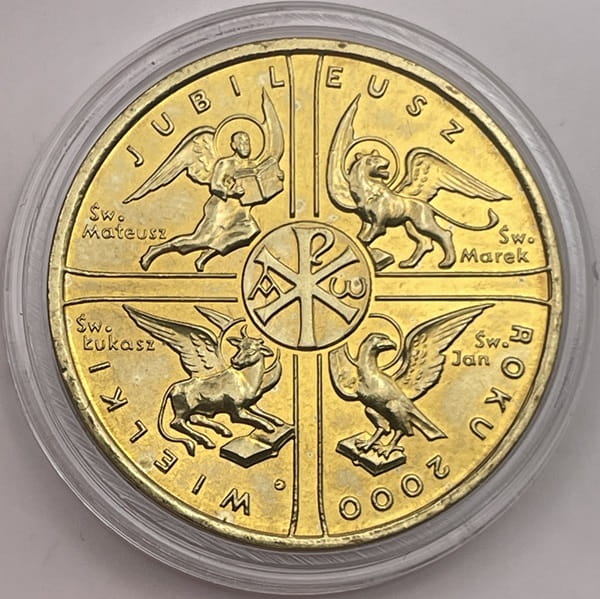 Na rewersie krzyż, a na jego środku greckie litery X (chi) oraz P (rho) - monogram Chrystusa, a także alfa i omega, czyli wczesnochrześcijański symbol Jezusa Chrystusa. Pomiędzy ramionami krzyża zostały przedstawione symbole Ewangelistów: Człowiek i napis Św. Mateusz, byk a obok napis Św. Łukasz, lew i napis Św. Marek oraz orzeł i napis. św. Jan. W otoku monety napis: WIELKI JUBILEUSZ ROKU 2000.