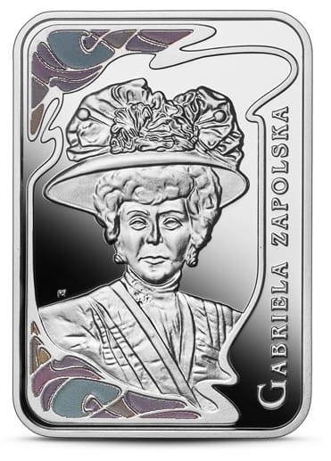 20 złotych Gabriela Zapolska 2022 r. - srebrna moneta kolekcjonerska 20 złotych, emitent Narodowy Bank Polski - NBP, producent Mennica Polska S.A., temat indywidualny, stempel zwykły moneta oksydowana oraz transparentna żywica.