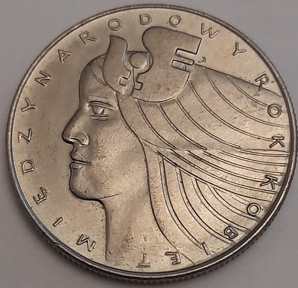 Na rewersie w jej centrum znajduje się głowa kobiety z lewego profilu. W otoku monety przy jej rancie napis: MIĘDZYNARODOWY ROK KOBIET. U góry przy włosach znak projektanta monety