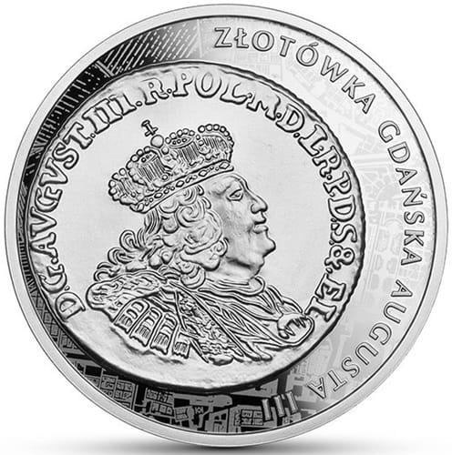 Na rewersie na pierwszym planie widnieje stylizowana dawna moneta z popiersiem Augusta III Sasa. gdańskiej złotówki. W otoku monety półkolem od góry ku dołowi dużymi literami napis: Złotówka gdańska Augusta III