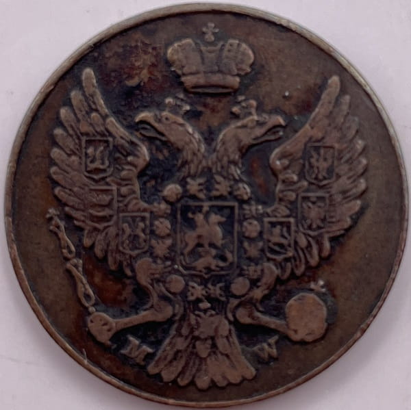 Na niemal całej powierzchni awersu orzeł carsko-królewski. U dołu monety po lewej stronie litera M, a po prawej litera przy łapach orła. Nad głowami orłów korona z krzyżem
