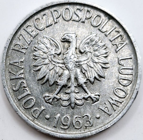 5 groszy 1963 r. - moneta obiegowa z okresu II Rzeczpospolitej Polskiej, metal aluminium, emitent Bank Polski, stempel zwykły, stan zachowania 2/+2