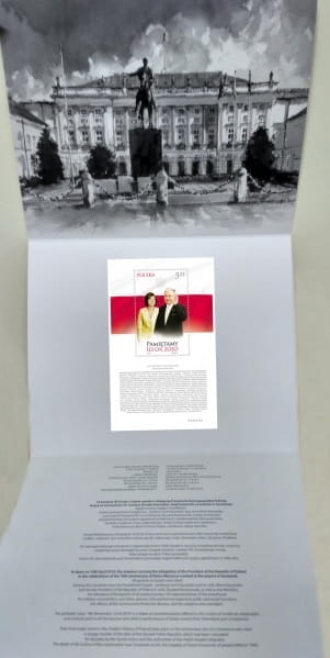 U góry po lewej stronie czerwoną czcionką dużymi literami napis Polska, a po prawej nominał znaczka 5 zł. U dołu małą czcionką po lewej projektant znaczka A. Grosik, po prawej stronie napis PWPW SA oraz rok emisji 2017. Na grafice para prezydencka Lech i Maria Kaczyńscy na tle białoczerwonej flagi.