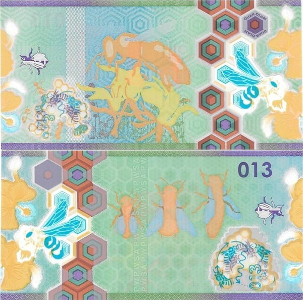 Na rewersie podział jaki występuje wśród pszczół miodnych, robotnica, truteń i królowa matka. U góry banknotu czerwoną czcionką seria i jej numer. W prawym górnym rogu oznaczenie 013