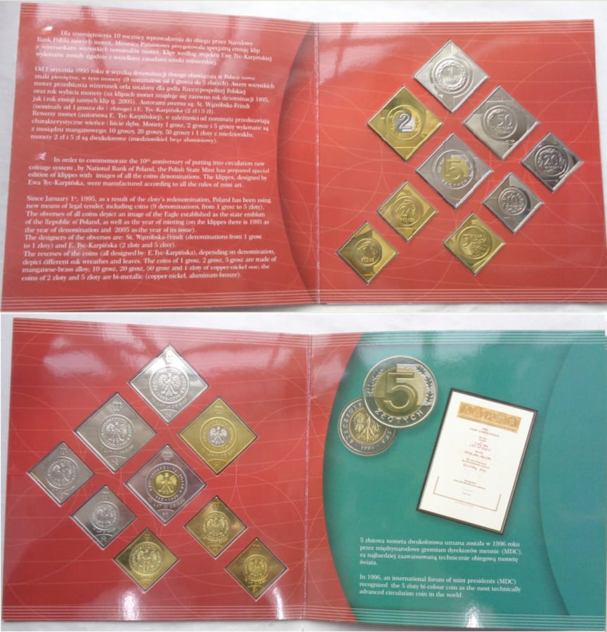 Klipy wykonane przez Mennicę Polska z okazji upamiętnienia wprowadzenie nowych monet powszechnego obiegu po denominacji w 1995 roku.