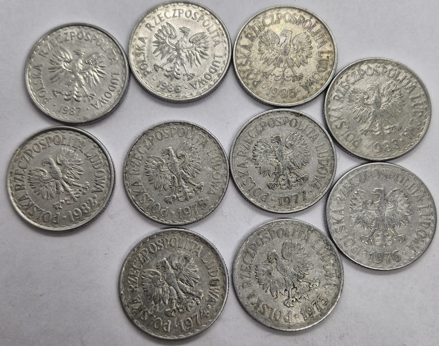 W zestawie 10 monet o nominale 1 złoty z Polskiej Rzeczpospolitej Ludowej z rocznikami: