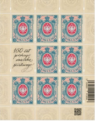 160 lat polskiego znaczka pocztowego 2020 r. - arkusz znaczków kolekcjonerskich o ograniczonym nakładzie pojedynczego znaczka 120 000 szt. w formacie 31,25 mm x 39,50 mm, materiał papier fluorescencyjny, technika druku offsetowa. Arkusz 8 znaczków oraz przywieszka niestemplowany, perforowany, stan zachowania nowy