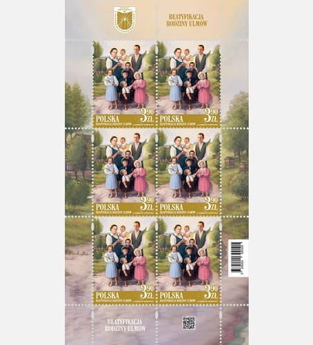 Arkusz Beatyfikacja rodziny Ulmów 2023 r. - arkusz znaczków kolekcjonerskich o ograniczonym nakładzie pojedynczego znaczka 120 000 szt. w formacie 43, 00 mm x 31,25 mm, materiał papier fluorescencyjny, technika druku offsetowa. Arkusz 6 powtarzających się znaczków niestemplowany w układzie 2x3, perforowany, stan zachowania nowy